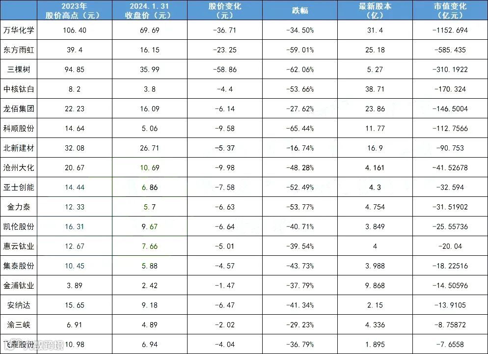 据悉,以上十几家化工上市公司市值蒸发累计超过2700多亿,且万华化学、中核钛白、龙佰集团、科顺股份等市值蒸发均超过100亿元。值得注意的是,涂料、防水行业,以及与涂料行业密切相关的钛白粉等原材料等行业,上市公司从去年股价高点当日到2024年1月31日,股价均出现大幅下滑,东方雨虹、科顺股份、金力泰、中核钛白等股价跌幅超过50%。这些上市公司市值下滑的同时,股东也被连累,平均每户缩水高达几十万元,最高超过200万元。