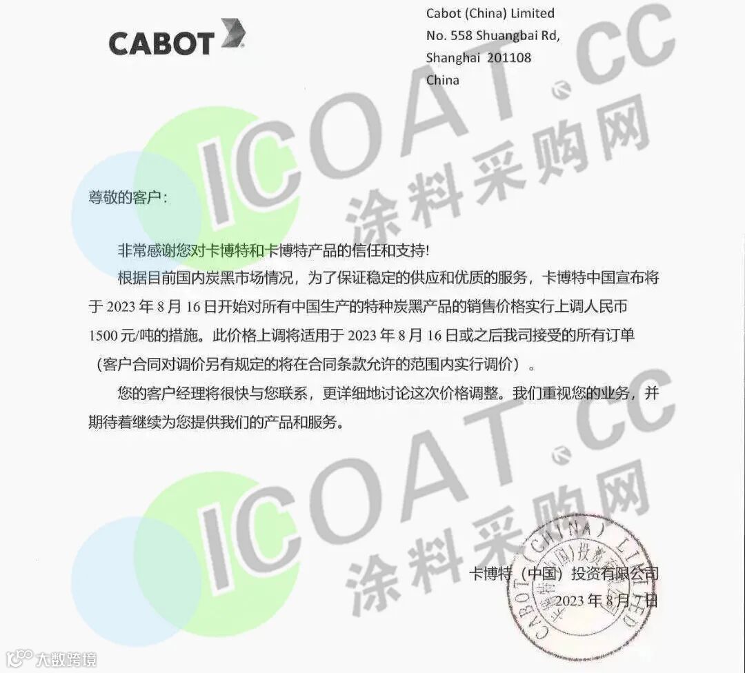 8月份开始,炭黑价格触底反弹。目前橡胶用炭黑价格已经突破一万大关,且还呈现往上飙升的态势。2023年9月15日炭黑价格为11000元/吨左右,并且还有继续上涨之势。炭黑龙头卡博特宣布对所有中国生产的特种炭黑产品的销售价格实行上调人民币1500元/吨。
