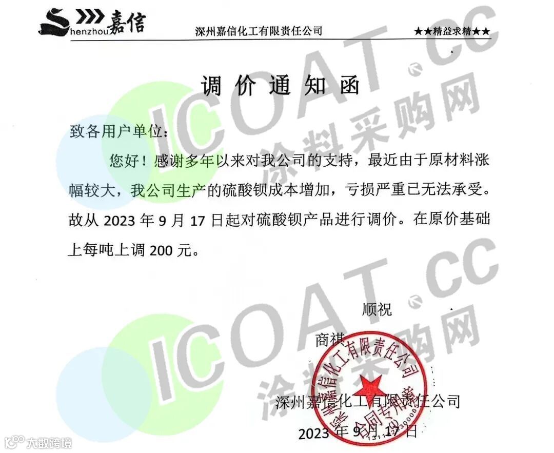 近日,深州嘉信化工发布调价函,称生产硫酸钡成本增加,亏损严重已无法承受,故从2023年9月17日起对硫酸产品上调200元/吨。