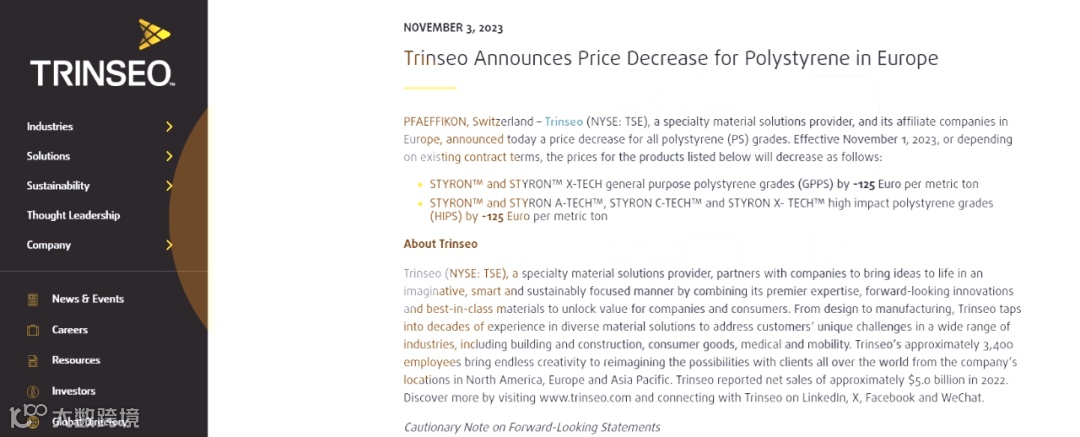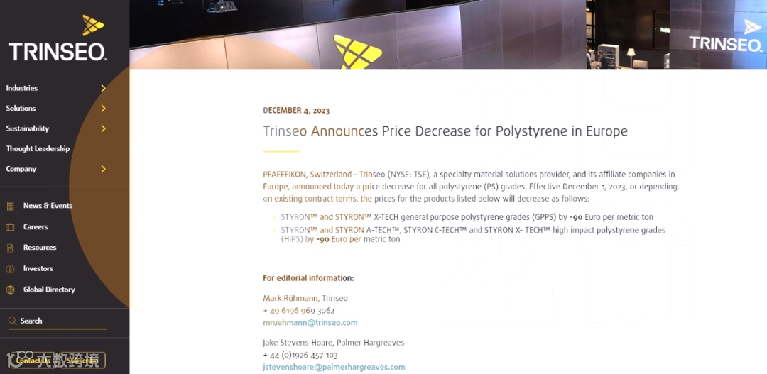 此前,盛禧奥官网也曾宣布,自11月1日起降低所有聚苯乙烯(PS)等级产品价格。其中通用聚苯乙烯(GPPS)和高抗冲聚苯乙烯产品均下调125欧元/吨。
