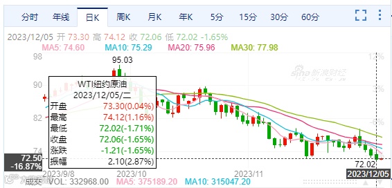 自欧佩克+会议宣布新一轮额外减产以来,国际原油连续第四个交易日走低,跌至五个月低点。WTI原油收跌1.65%,报72.06美元/桶;布伦特原油收跌1.55%,报77.01美元/桶。