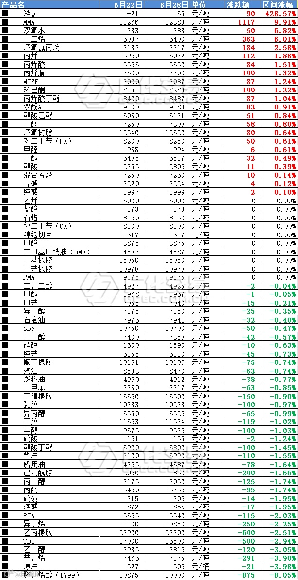 端午节后一周,化工大宗市场反应平平,好消息是,目前全线大跌的局面稍稍稳住了,部分厂家也开始缓慢回调。