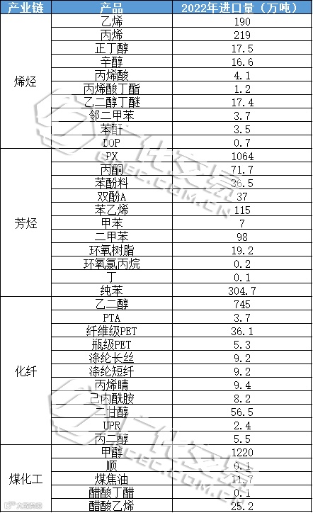 另外,还有超40种基础化工原料需要进口采购,累计进口量超4300万吨,涉及煤化工、烯烃、化纤等多个产业链。值得关注的是,PX、甲醇进口量超过1000万吨,乙烯、丙烯、苯乙烯、纯苯等进口量超过100万吨。
