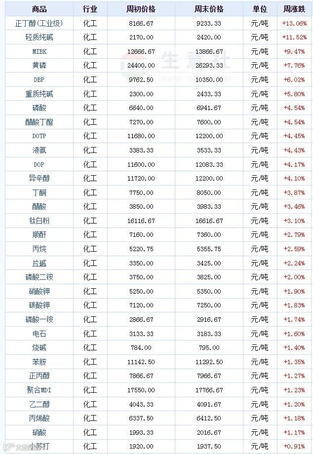 其中,硫酸、醋酸、纯碱、液氯近一个月涨幅达30%以上,异丁醇、辛醇、正丁醇、丙二醇、醋酸丁酯涨跌额也超1000元/吨。