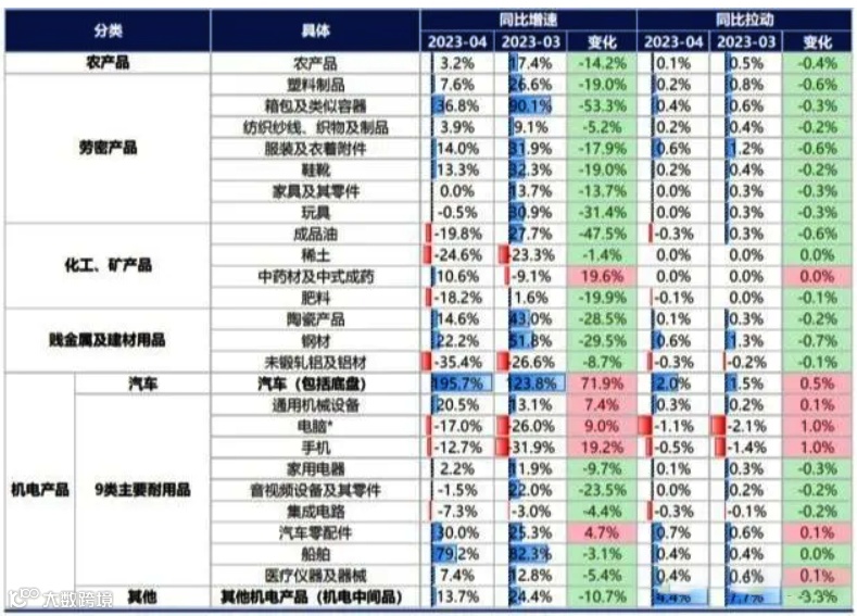从国内出口产品结构看,化工、矿产品与贱金属及建材用品出口较3月明显回落。4月化工、矿产品出口同比-18.9%,3月为20.7%,2022年平均46.2%;