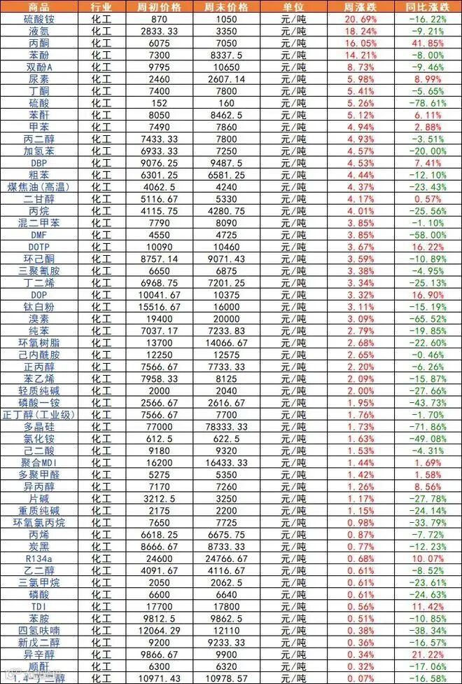 双酚A下半年以来上涨600元/吨,涨幅6.56%;
