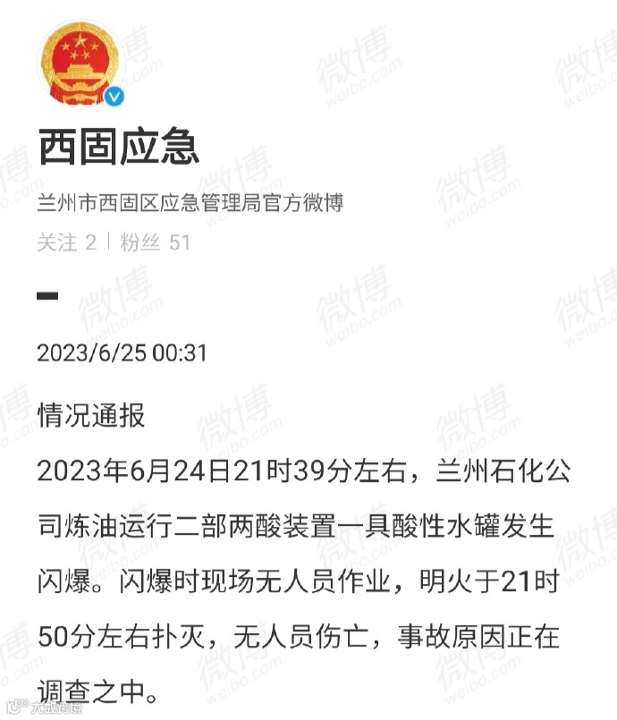 据西固区应急管理局工作人员透露,涉事企业系中国石油天然气股份有限公司兰州石化分公司(下称“兰州石化公司”)。事发在24日21时许,该公司一具酸性水罐发生闪爆。随后,兰州市消防救援支队西固区大队等部门迅速到场处置,22时许明火被扑灭。
