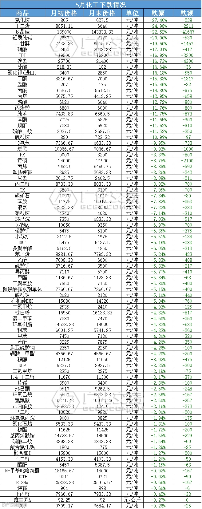 5月的化工市场可谓是哀嚎遍野。据数据监测,84种化工产品价格下跌,占比高达75%。其中月跌幅超15%的产品多达12个,跌额超过500元/吨的更是高达30个,多晶硅一个月跌41667元/吨,至143333元/吨。丁二烯、TDI、溴素、黄磷月跌额超2000元/吨!
