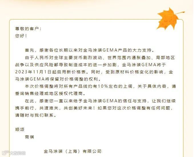 近日,金马涂装发布涨价函,称由于人民币对全球主要货币剧烈波动、世界范围内通胀叠加、局部地区战争以及供应风险都导致制造成本的进一步加剧。