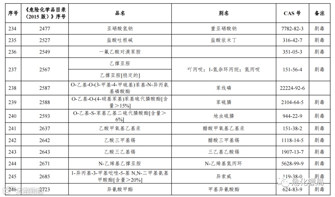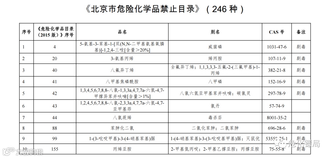 八甲磷、克百威、水银等246种危化品拟被列入禁止目录,在北京行政区域内禁止生产、储存、使用、经营和运输(含过境运输)。确需使用且符合首都功能定位和产业发展需求的,只能以符合要求的化学试剂包装和气瓶气体形式使用和运输。