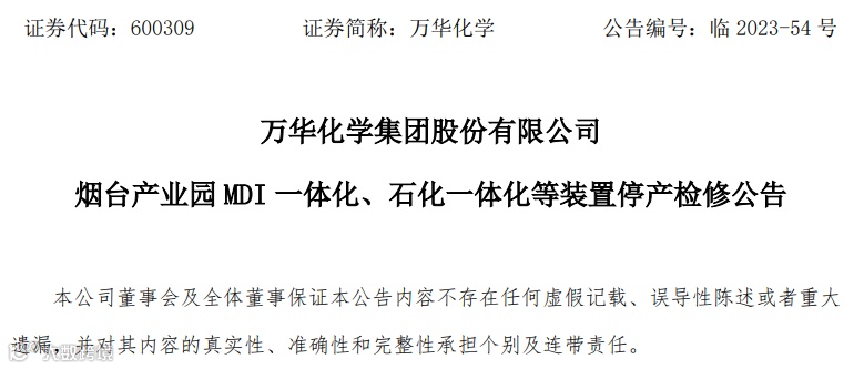8月11日,万华化学发布公告称,根据化工企业生产工艺特点,为确保生产装置安全有效运行,按照年度检修计划,公司烟台产业园MDI一体化(主要包括MDI 110万吨/年、TDI 30万吨/年)、石化一体化(主要包括PDH 75万吨/年、PO/MTBE 24/76万吨/年)及相关配套装置将于2023年8月15日开始停产检修,预计检修40天左右。