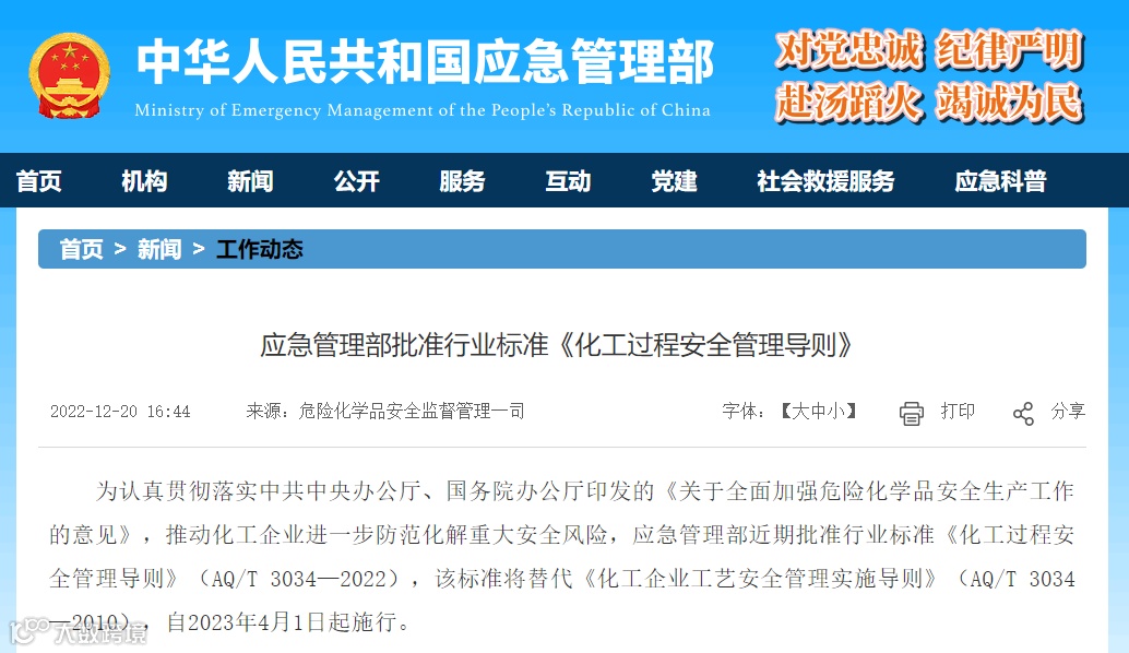 2023年4月1日,应急管理部批准的行业标准《化工过程安全管理导则》(AQ/T 3034—2022)正式施行,对原标准的要素内容进行了较大调整和修改,由原先的12个要素增加至20个要素,其中安全领导力、安全生产责任制、本质更安全等8个要素为新增项。