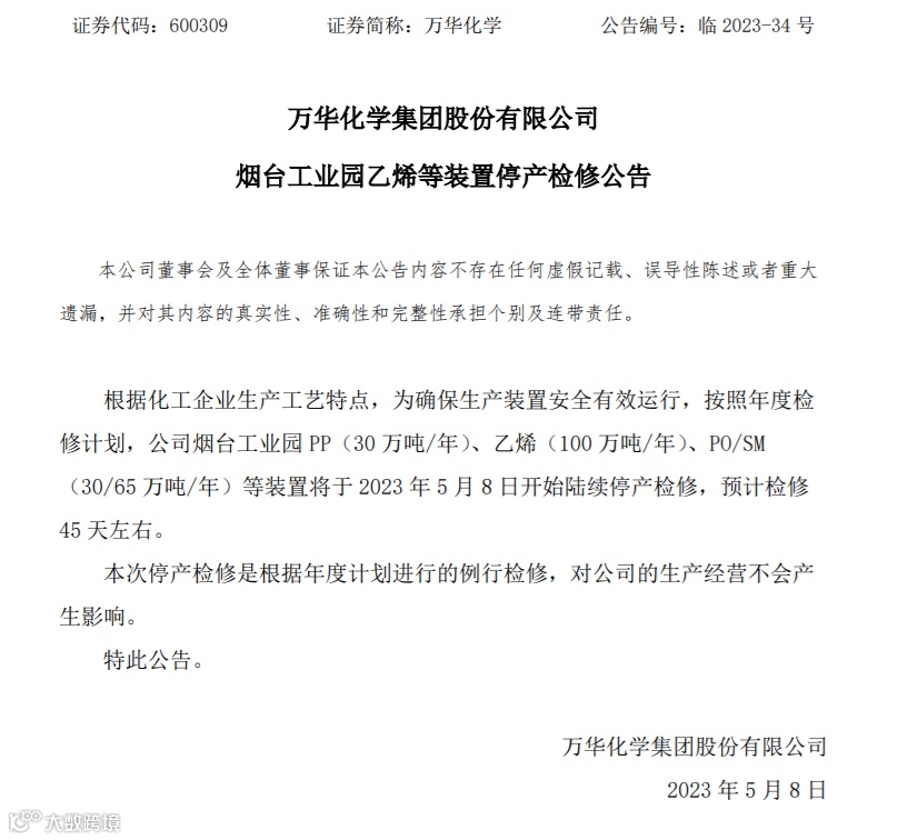 万华化学烟台工业园PP(30万吨/年)、乙烯(100万吨/年)、PO/SM(30/65万吨/年)等装置于5月8日开始陆续停产检修,预计检修45天左右。
