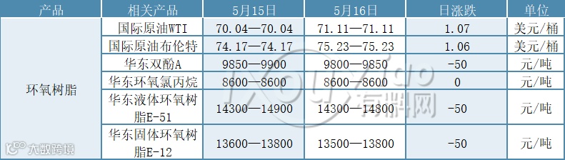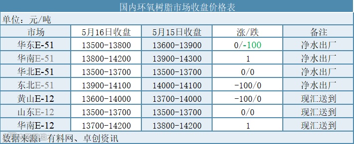 今日环氧树脂市场清淡运行,下游需求疲乏,成交极少。原料双酚A及环氧氯丙烷微跌,树脂成本支进一步削弱。今华东液体环氧树脂主流商谈参考13500-13800元/吨净水出厂。