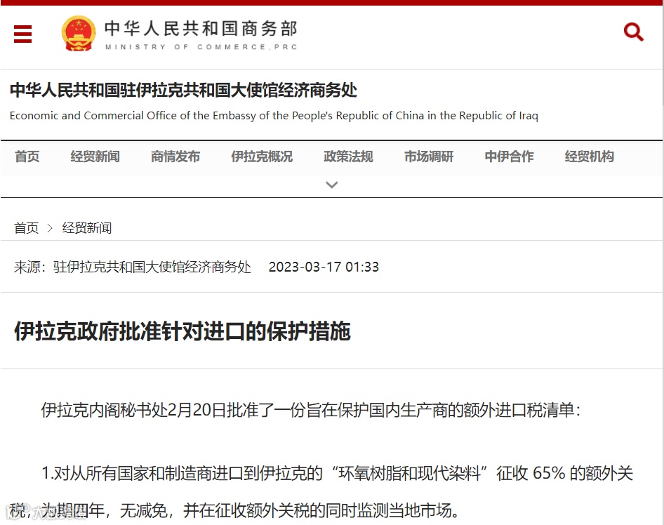 日前,中国驻伊拉克大使馆经商处网站发布消息,伊拉克内阁秘书处2月20日批准了一份旨在保护国内生产商的额外进口税清单: