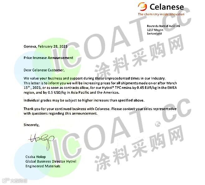 近日,海外化工巨头塞拉尼斯发布涨价函,宣布提高Hytrel® TPC热塑性弹性体产品的价格。其中,中东、非洲和欧洲地区价格上涨450欧元/吨(约合人民币3355元/吨);亚太和美洲地区价格上涨500美元/吨(约合人民币3440元/吨)。