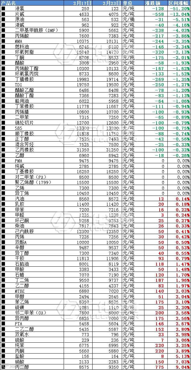 本周,化工品整体行情分化明显,主流产品如原油、片碱、液碱、环氧树脂、TDI均有不同程度下滑。
