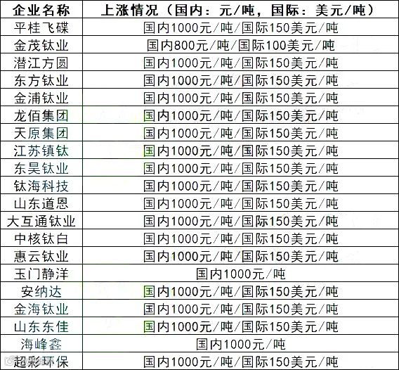 自节后以来,钛白粉价格持续上涨,目前已有20多家钛白粉企业发函调涨,国内普涨1000元/吨左右,国际普涨80-150美元/吨左右。由于春节期间多数钛白粉企业检修,市场供应少,市场整体库存低位,预计后续钛白粉还有望继续上涨。