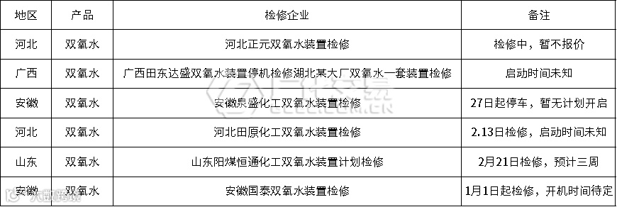 双氧水:近期检修多,涉及多个地区