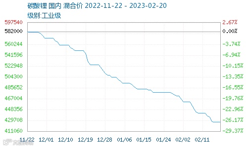 碳酸锂去年行情一路高歌,甚至一度价格高涨至60万元/吨,如今也开始走“下坡路”,自去年12月份以来,碳酸锂价格就开始一路走跌,至今已从582000元/吨下跌至429700元/吨附近,跌超152000元,跌幅达26%。