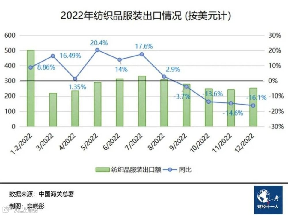 国联宏观首席分析师樊磊表示,外部环境不稳定因素增多,美国仍在推进供应链去中国化,这也是今年出口面临的一个挑战。2022年11月,美国对中国服装进口量同比几乎减半,降幅达47%,进口额同比下降38%。2022年1月~11月,中国占美国服装进口的市场份额从一年前的24.1%下降到22%。