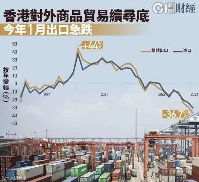 2月27日,香港政府统计处公布数据显示,2023年1月,香港对外贸易出现了70年来最大的跌幅(1953年9月以来)。其中,出口下跌了36.7%,进口下跌了30.2%。