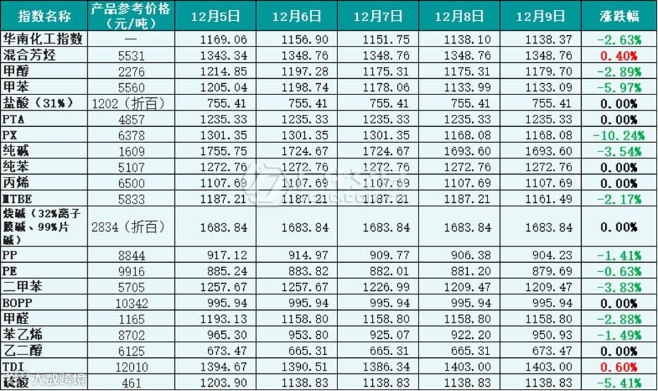 华南化工指数上周参考数据(基数:1000),参考价为贸易商报价