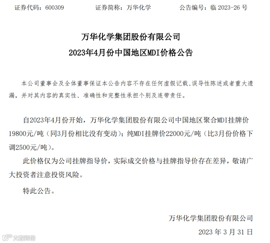 自2023年4月份开始,万华化学中国地区聚合MDI挂牌价19800元/吨(同3月份相比没有变动);纯MDI挂牌价22000元/吨(比3月份价格下调2500元/吨)。