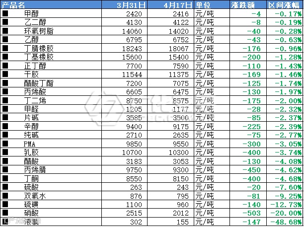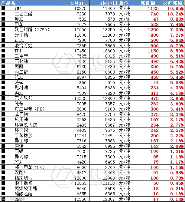 “银四”已过半,各位老板们生意还好吗?都说原油涨,啥都涨,根据广化君监测数据来看,4月大宗商品市场同3月相比有较大回温,自3月底至17日,广化君监测的67种产品中有37种原料价格上涨,其中,MMA、聚乙烯醇(1799)、TDI上涨超1000元/吨。