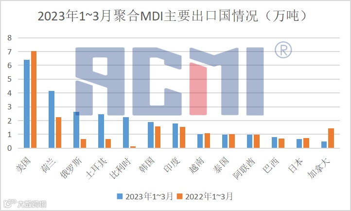 2023年由于海外成本高企和供应端偏紧,我国MDI出口依然保持较高增速,据海关数据显示2023年1-3月,中国聚合MDI累计出口量30.95万吨,同比增长28.05%。值得注意的是,欧洲/中东地区出口量增长强劲,今年1-3月我国至荷兰、俄罗斯、土耳其和比利时的聚合MDI出口量同比增长更为强劲。其中出口至荷兰的聚合MDI出口量为4.13万吨,同比增长83.86%,至俄罗斯出口量为2.63万吨,同比增长293.6%,至土耳其出口量为2.46万吨,同比增长262.08%,至比利时出口量为2.23万吨,同比增长1391.96%。