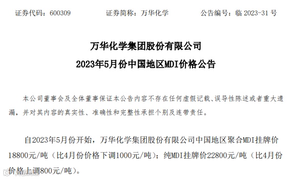 4月28日,万华化学集团股份有限公司发布公告称:自2023年5月份开始,万华化学集团股份有限公司中国地区聚合MDI挂牌价 18800元/吨(比4月份价格下调1000元/吨);纯MDI挂牌价22800元/吨(比4月份价格上调800元/吨)。