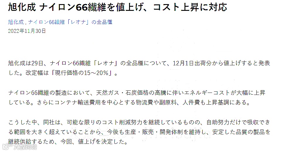 11月30日,旭化成称随着天然气煤炭价格的高涨,能源成本大幅上升,加之其他成本费用不断推高,自12月1日起上调公司PA66纤维产品价格,在现有价格的基础上上调15%-20%。
