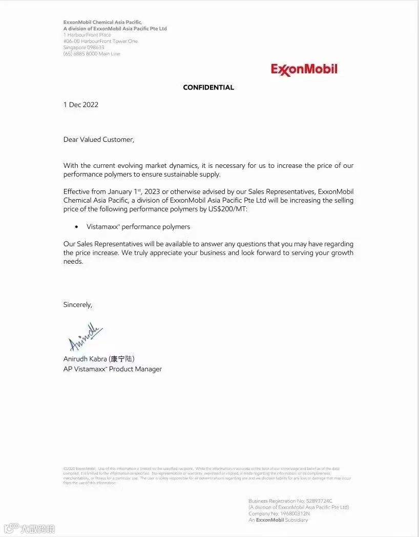 自2023年1月1日起,埃克森美孚亚太化学公司Vistamaxx高性能聚合物的售价提高200美元/吨,折合人民币1405元/吨。