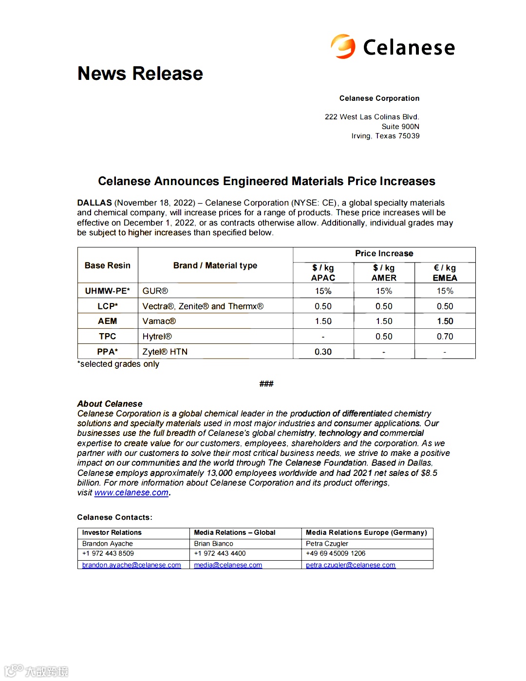 11月18日,,塞拉尼斯发布工程塑料涨价通知,其中亚太地区具体涨幅如下: