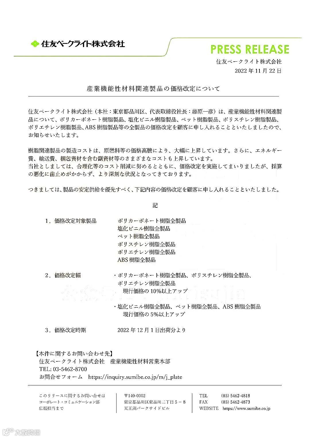 11月22日,住友电木株式会社发布通知称,由于原燃料等价格高涨,树脂相关产品的制造成本大幅上升。叠加能源费、运输费和包括包装材料在内的副材料成本也上升。
