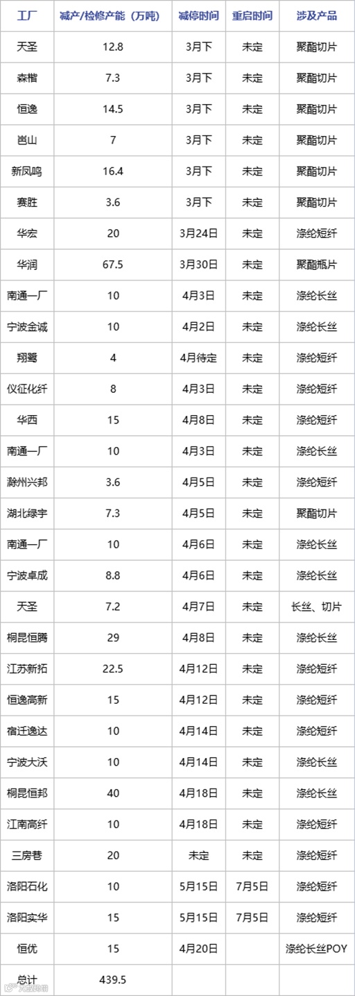 据了解,近期位于上述行业下游的聚酯产业链已经启动了减产大动作,累计减产近440万吨!