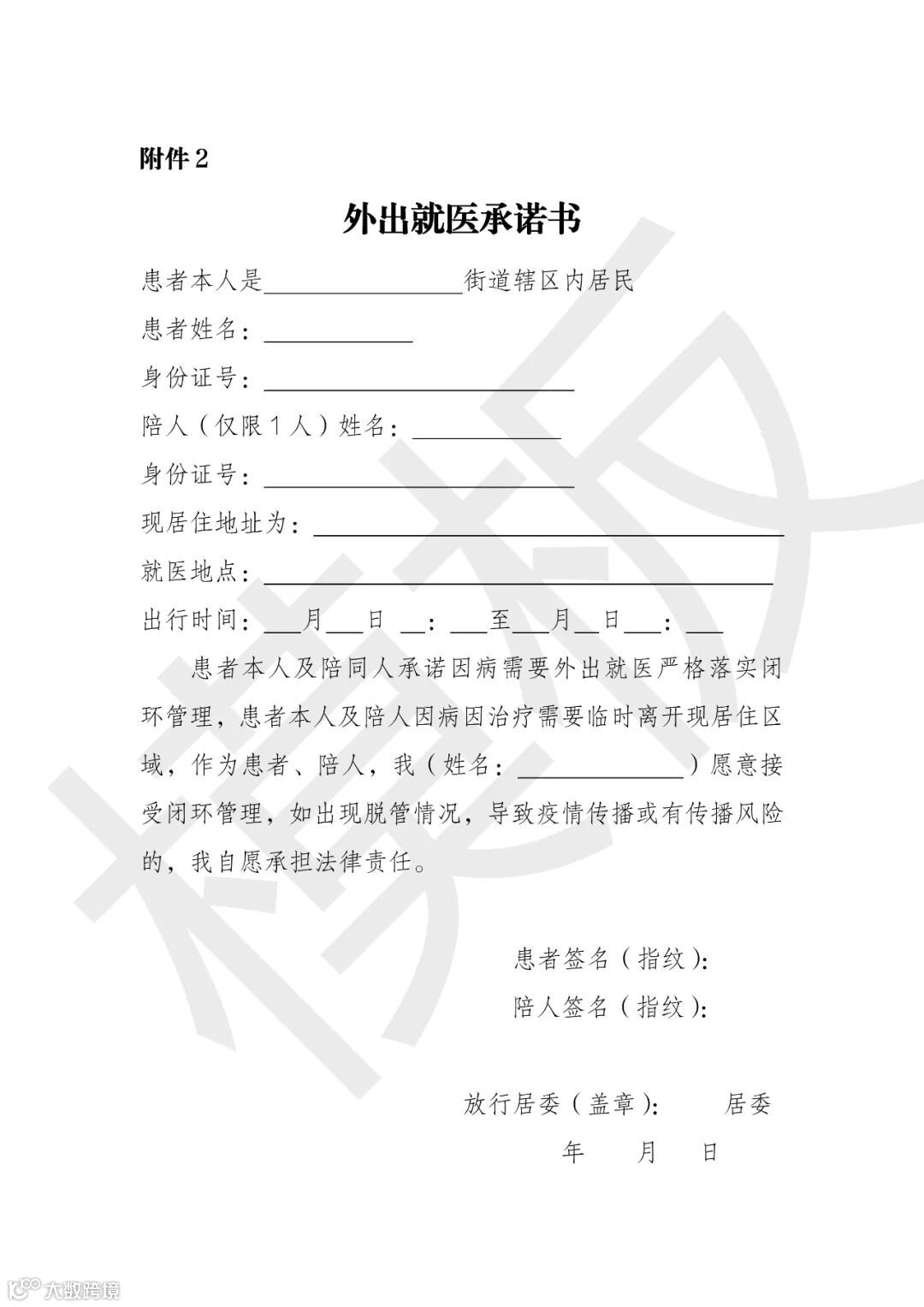 1.居民有外出就医需求,到所在居委开具《就医转诊卡》,签订承诺书;