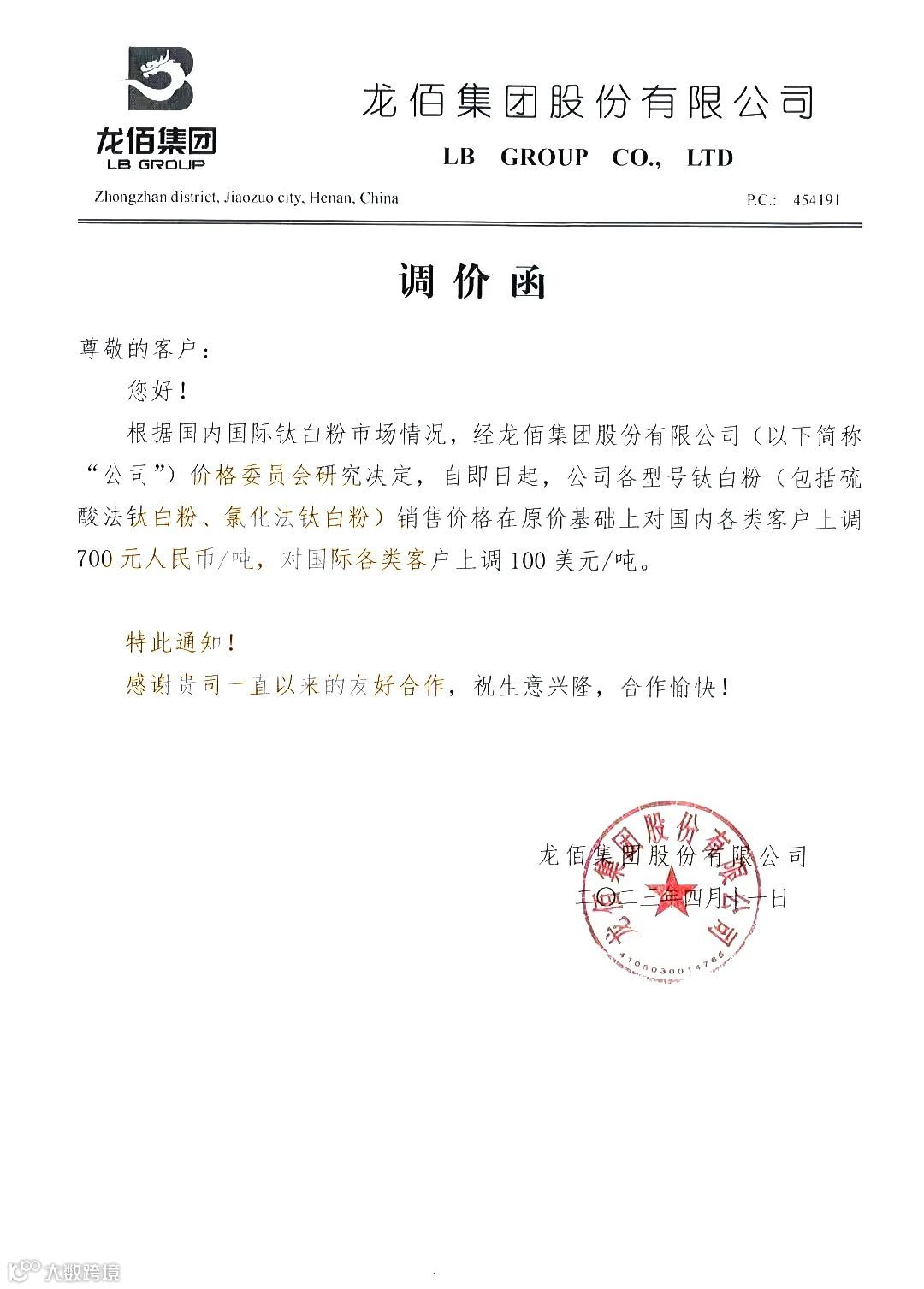 龙佰集团4月11日晚间公告,根据国内国际钛白粉市场情况,经公司价格委员会研究决定,自即日起,公司各型号钛白粉(包括硫酸法钛白粉、氯化法钛白粉)销售价格在原价基础上对国内各类客户上调700元/吨,对国际各类客户上调100美元/吨。