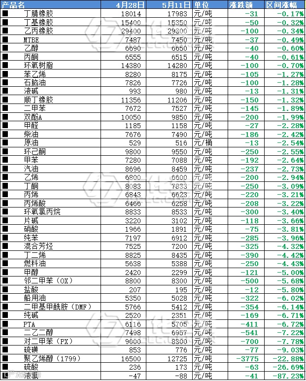 4月底聚乙烯醇(1799)报价16500元/吨,截止5月11日价格现已下跌3775元/吨,跌幅达22.88%。上游成本面持续弱势震荡,需求端短时内暂无向好预期,供应端开工负荷低位平稳,终端市场行情延续清淡,下游工厂开工情况欠佳,用户采购力度较弱,小单现货竞争压力较大, 聚乙烯醇市场难寻利好,市场弱势承压,预计下周聚乙烯醇市场或将延续盘弱整理。