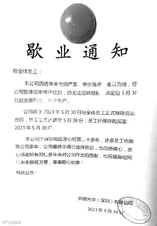近日,一张关于同德光学(深圳)有限公司(以下简称“同德光学”)宣布歇业的通知在网上流传。通告称公司因连年亏损、经营难以为继,经管理层研究后决定于2023年5月30日全面停止生产。
