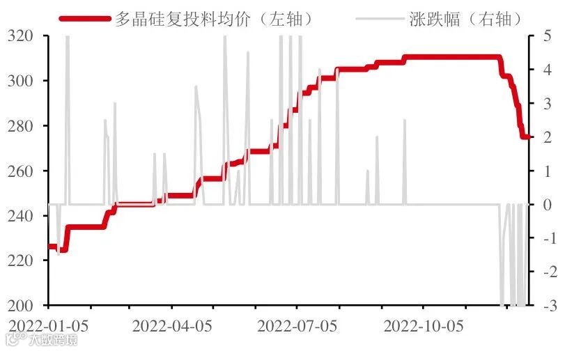 多晶硅:多晶硅价格维稳,据SMM 统计,多晶硅复投料报价270-280 元/千克;多晶硅致密料250-265 元/千克;多晶硅菜花料报价230-250 元/千克,颗粒硅250-270 元/千克。多晶硅产量不断提产,在价格下跌期间,签单情况也较弱,在硅片等环节累库情况下,预计多晶硅价格将继续回落,但由于产量提升,对工业硅需求仍将保持较高速度增长。