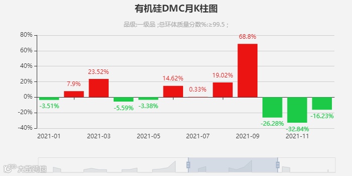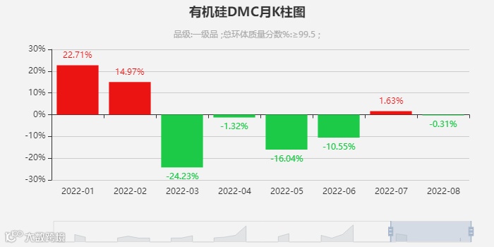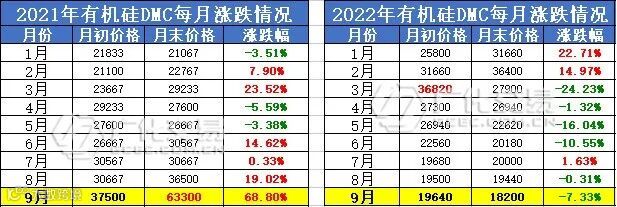 结合上述价格表,以及对比2021年及2022年的涨跌幅柱状图可知,2021年9月是有机硅DMC涨势最猛的一个月,而2022年9月有机硅却仍处于下行状态,业内一度有预言将跌破1.7万元!