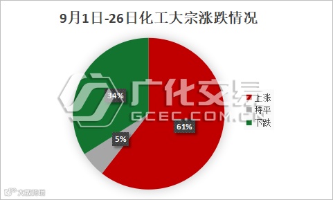 据广化君监测,9月化工大宗涨势明显,但涨幅相对较小。其中,上涨的化工大宗商品共计66种,占比61%;下跌的化工大宗商品共计37种,占比34%。