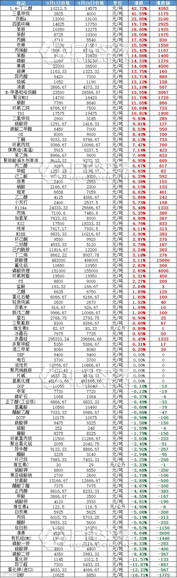 涨幅前三位是:1,4-丁二醇(42.72%)、三氯甲烷(41.59%)、双酚A(23.85%)