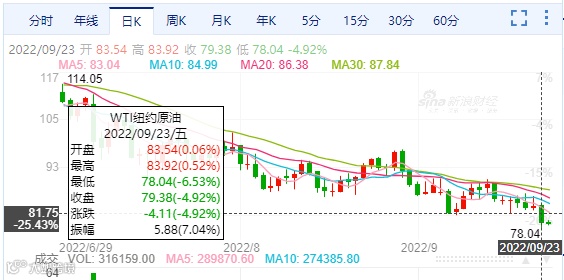 油价大跌!上周五,国际油价迎来大幅跌,其中WTI原油收盘79.38美元/桶,本次油价下跌主要受美元走强、全球主要央行加息加剧经济衰退担忧、美国石油库存全面上涨等因素的影响。