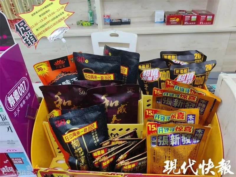 记者随后走访了中山门大街上的多家连锁超市,发现大部分超市都有槟榔售卖,与便利店不同的是,超市中的槟榔并没有和其他食品放在同一货架中售卖,而是放在了收银员的柜台上、与烟草产品摆在一起售卖。