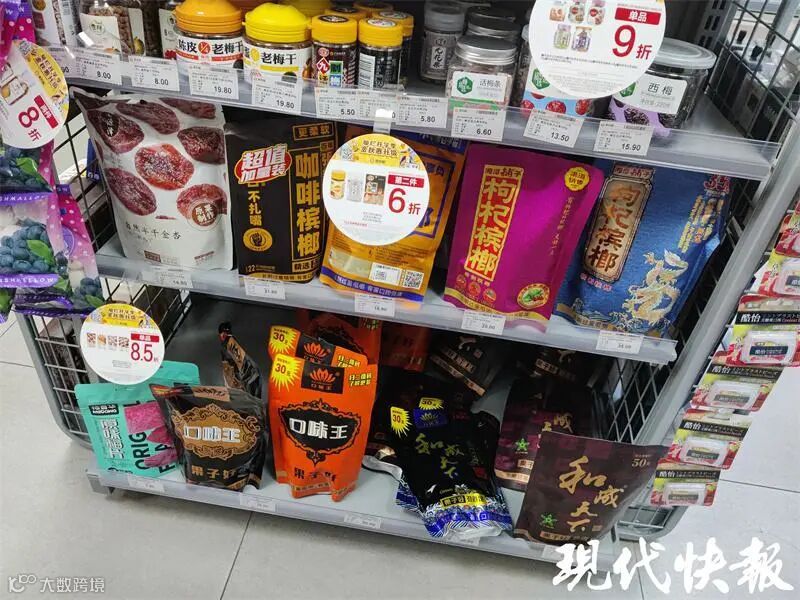 9月20日上午十点,记者随机走进仙林大学城中的一家连锁便利店,当问起是否有槟榔售卖时,店员立即表示“有货”,并将记者带到了售卖槟榔的货架前。记者注意到,该货架所售卖的货物除了形形色色各个品牌的槟榔外,还有话梅、无花果干等干果类食品,让人下意识感觉槟榔也是这些干果类食品中的一员。
