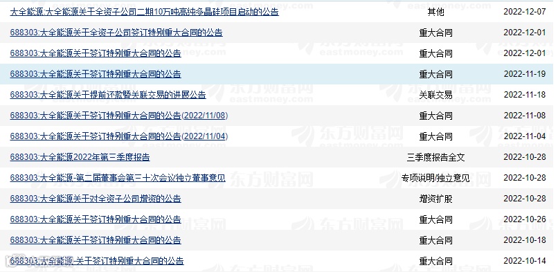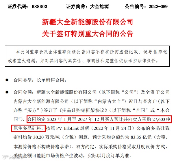 大全能源与某客户签订了《采购协议》,合同约定2023年1月至2027年12月某客户预计共向公司采购14.88万吨太阳能级一级品免洗块料,本次预计采购金额为450.86亿元。2022年以来,大全能源已经签下8个特别重大合同,合计约3700亿元长单。