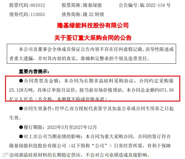 隆基绿能及9家子公司与大全能源子公司内蒙古大全新能源签订了多晶硅料长单采购协议,根据协议,双方自2023年5月至2027年12月期间多晶硅料交易数量为25.128万吨,预估本合同总金额约671.56亿元。