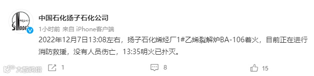 截止发稿,1#乙烯装置已停工,经对现场周边上下风向四个点位进行监测均无异常(事故初期产生的黑烟对装置周边存在一定的短暂影响)。